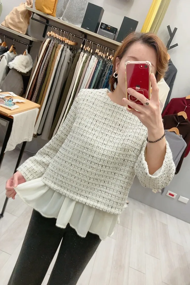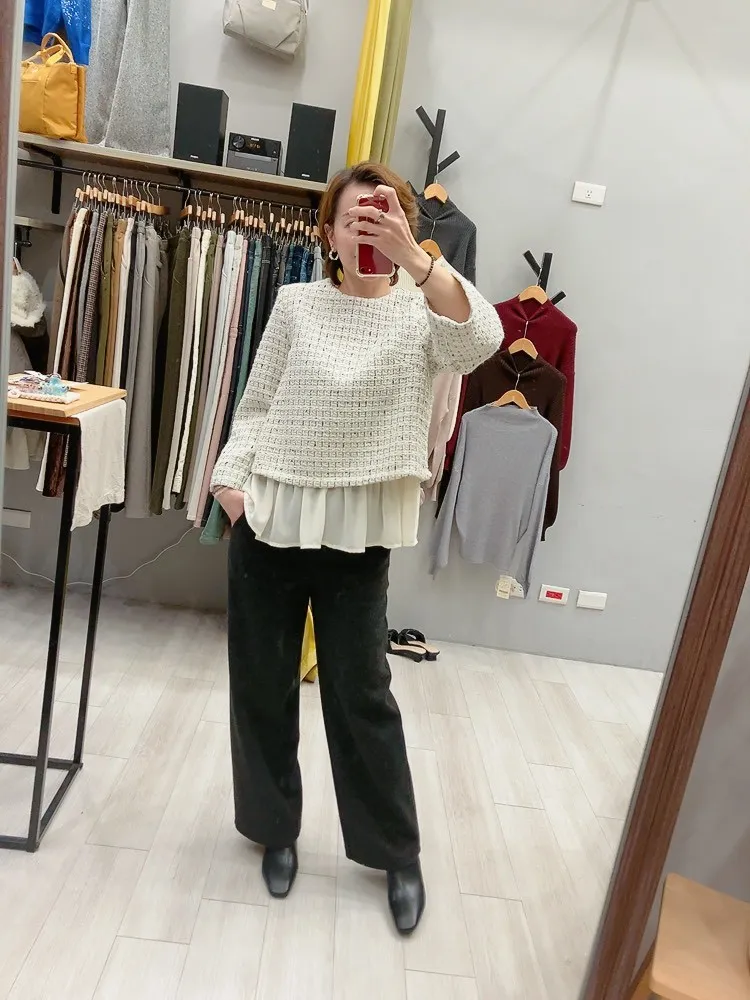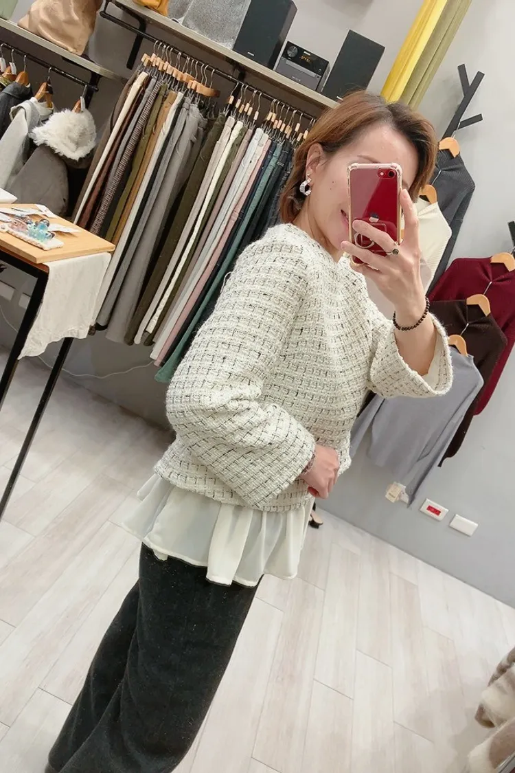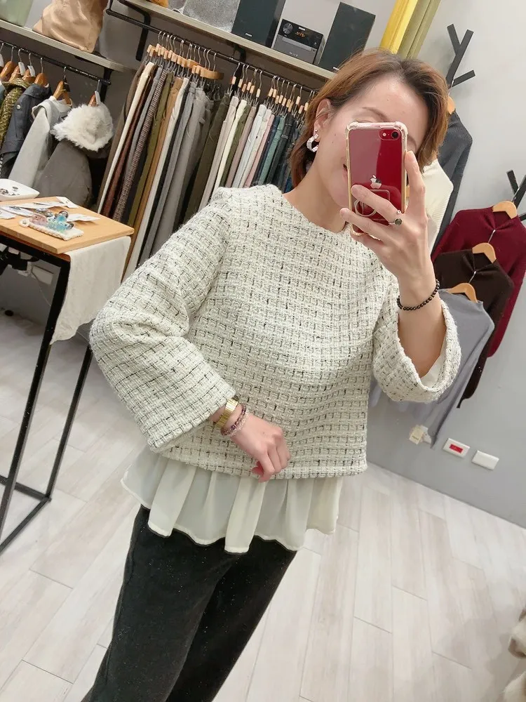 經典小香風遇上柔美雪紡襬,剛剛好的甜與優雅🤍不規則雪紡下襬增加層次感,走動時自然飄逸,視覺更顯纖細。搭配窄褲或裙裝都好看,是一件不用想搭配就很出色的上衣。 ✔ 修飾腰腹線條✔ 拉長比例不顯臀✔ 不貼身也不顯臃腫