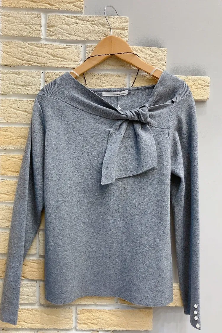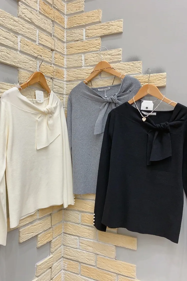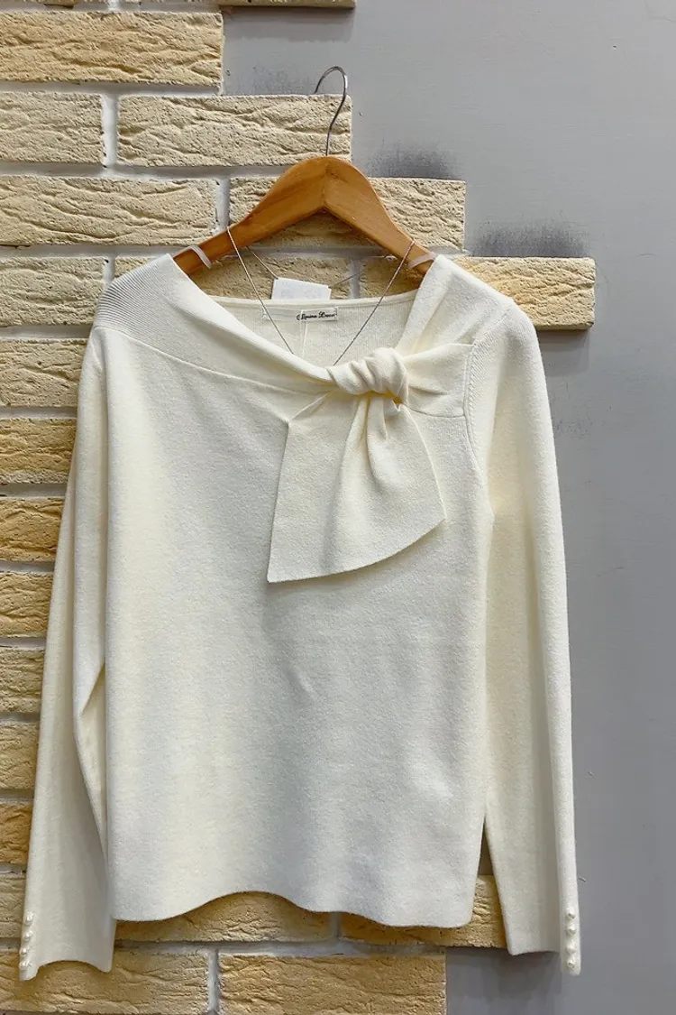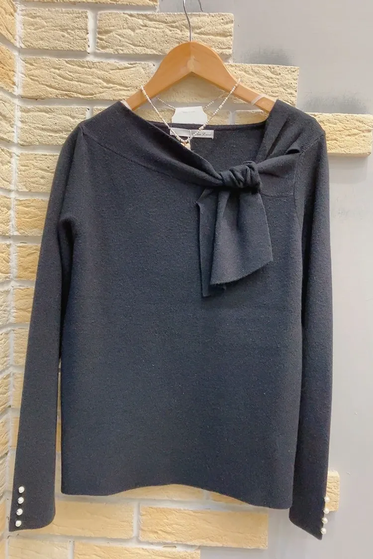 袖珍珠斜結領針織上衣