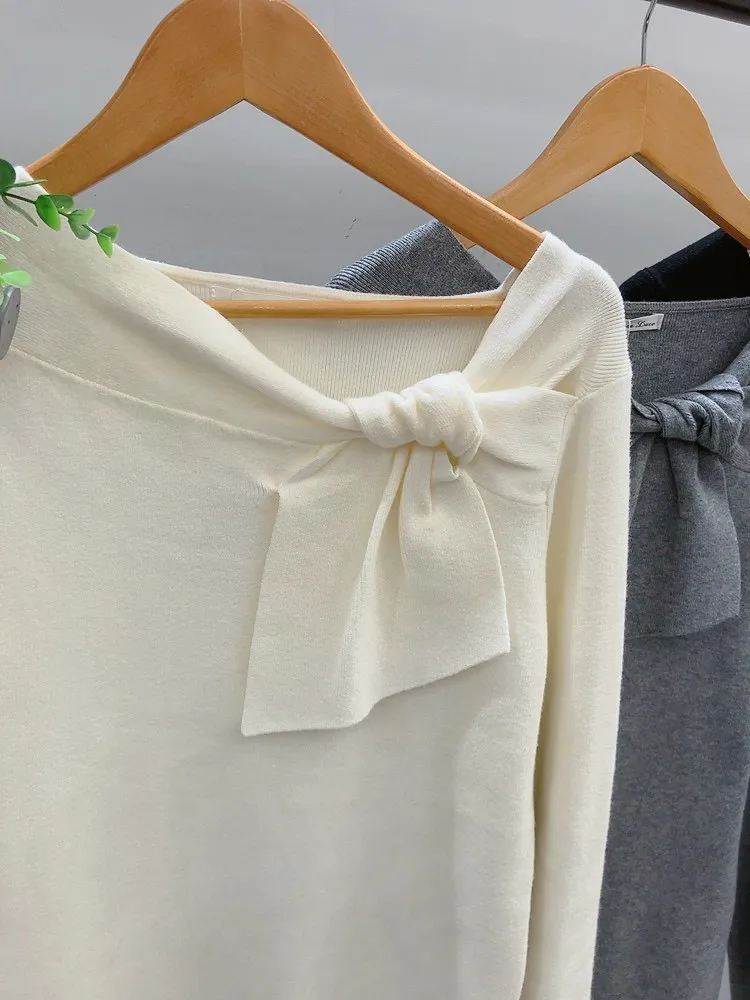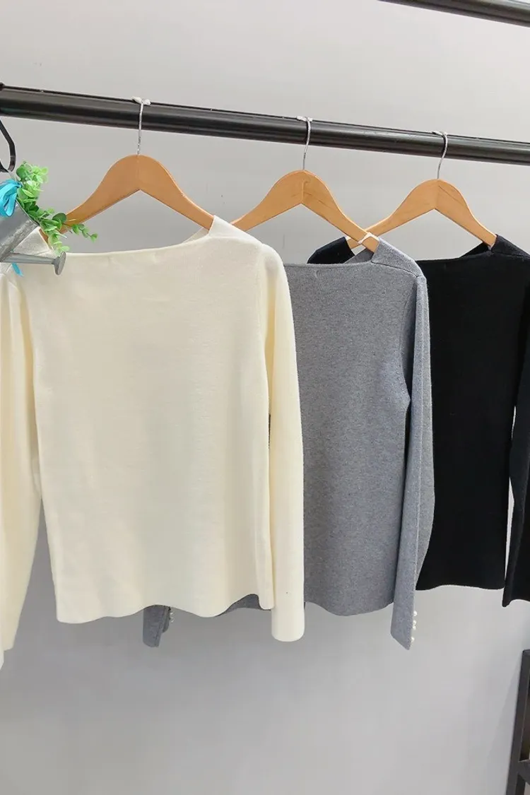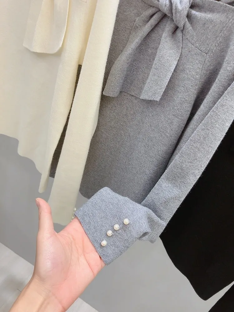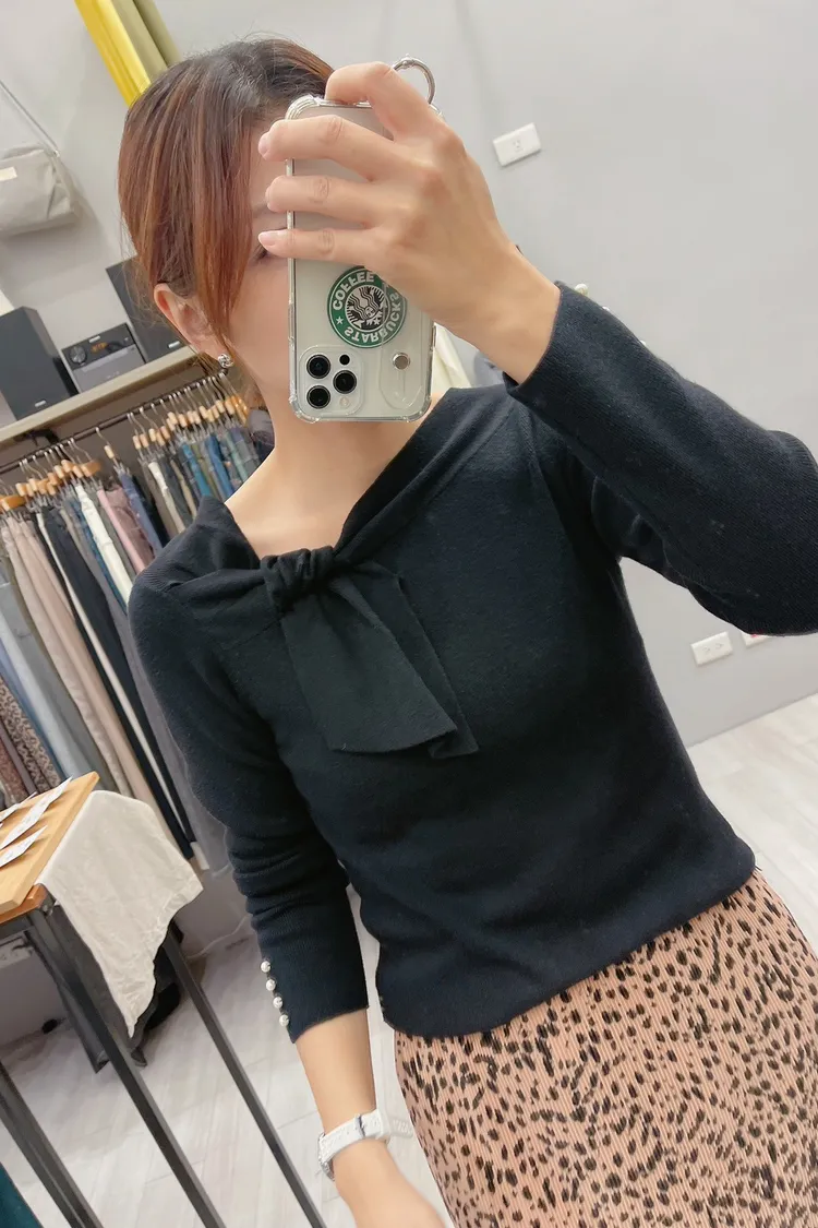 袖珍珠斜結領針織上衣