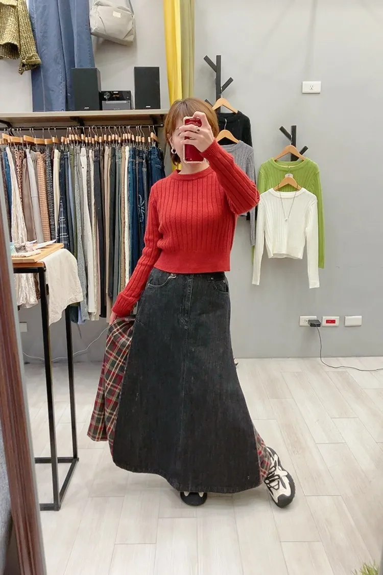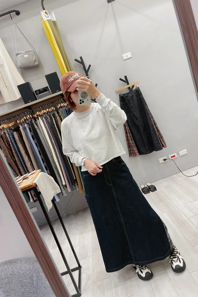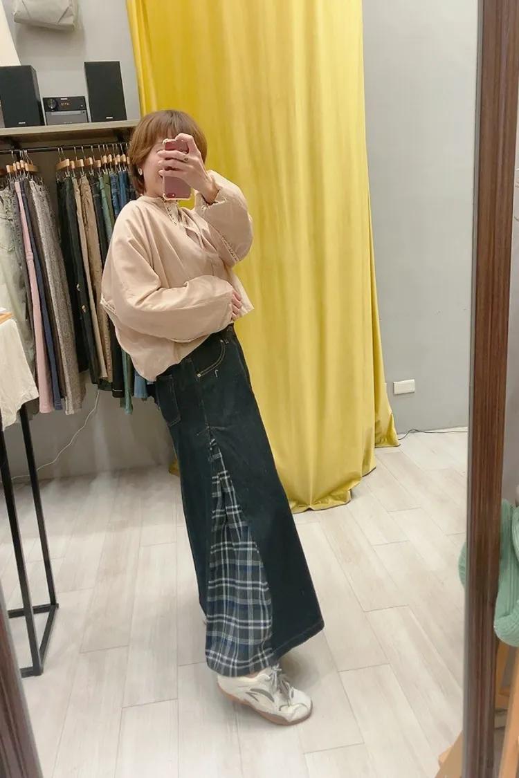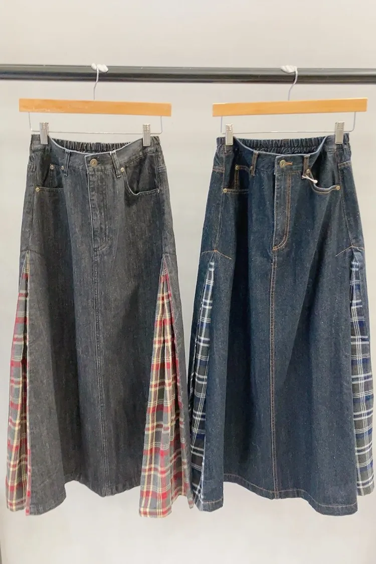側拼格紋牛仔裙