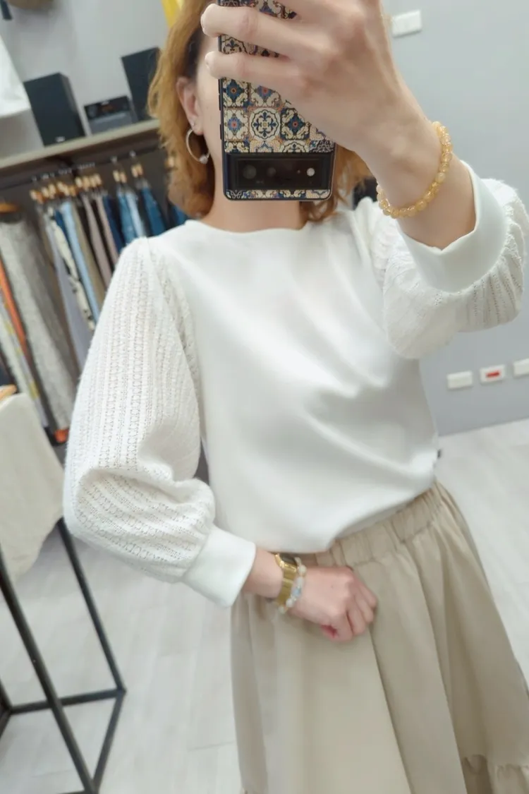 微閃直紋蕾絲六分袖上衣