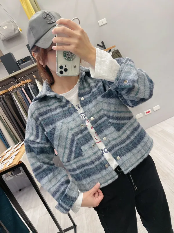 霧銀壓釦同色系格紋襯衫外套