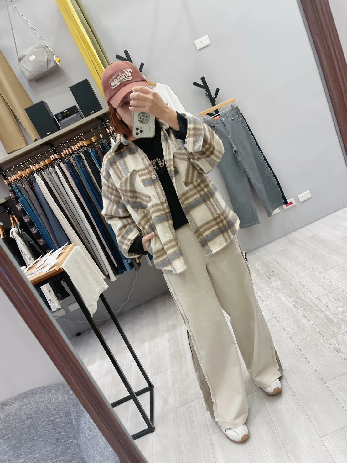 雙口袋中長大格襯衫外套