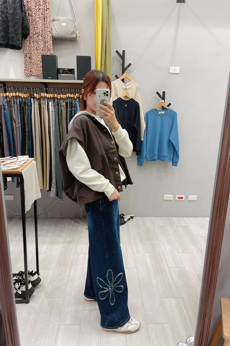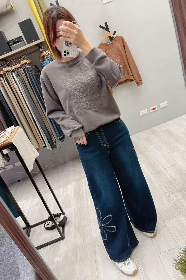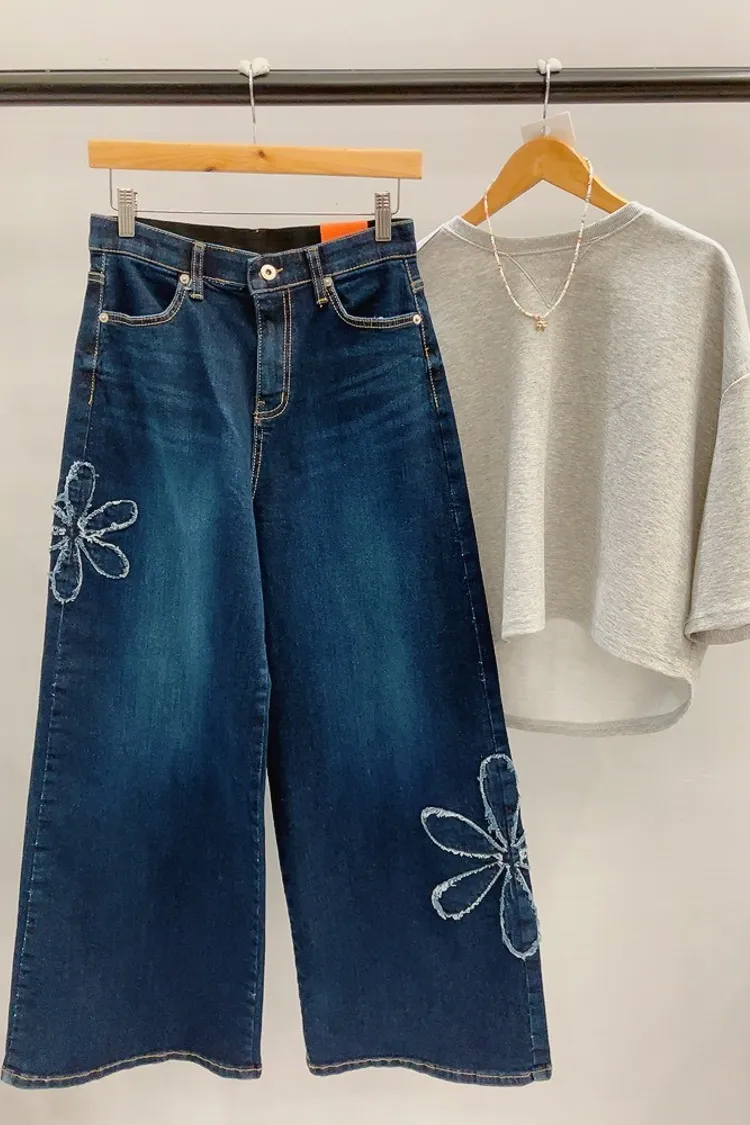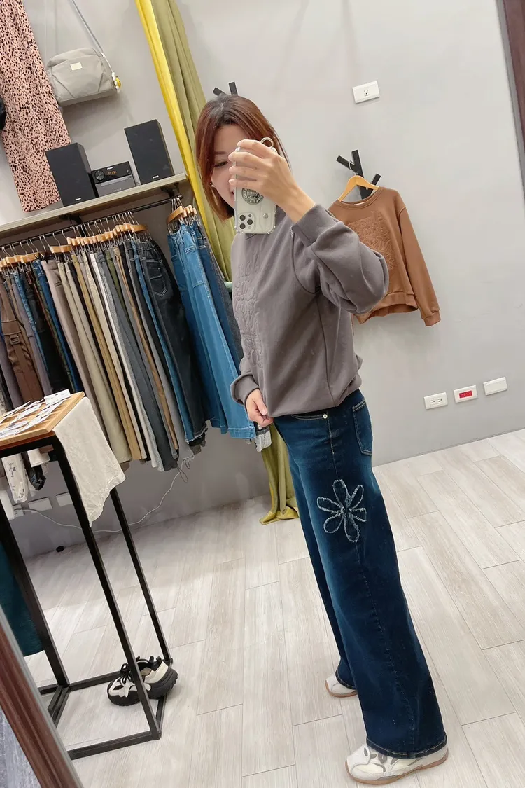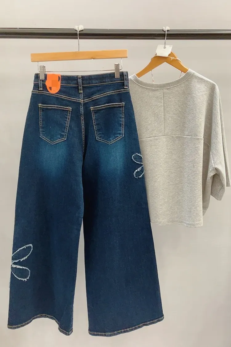 綴大花寬直筒牛仔褲