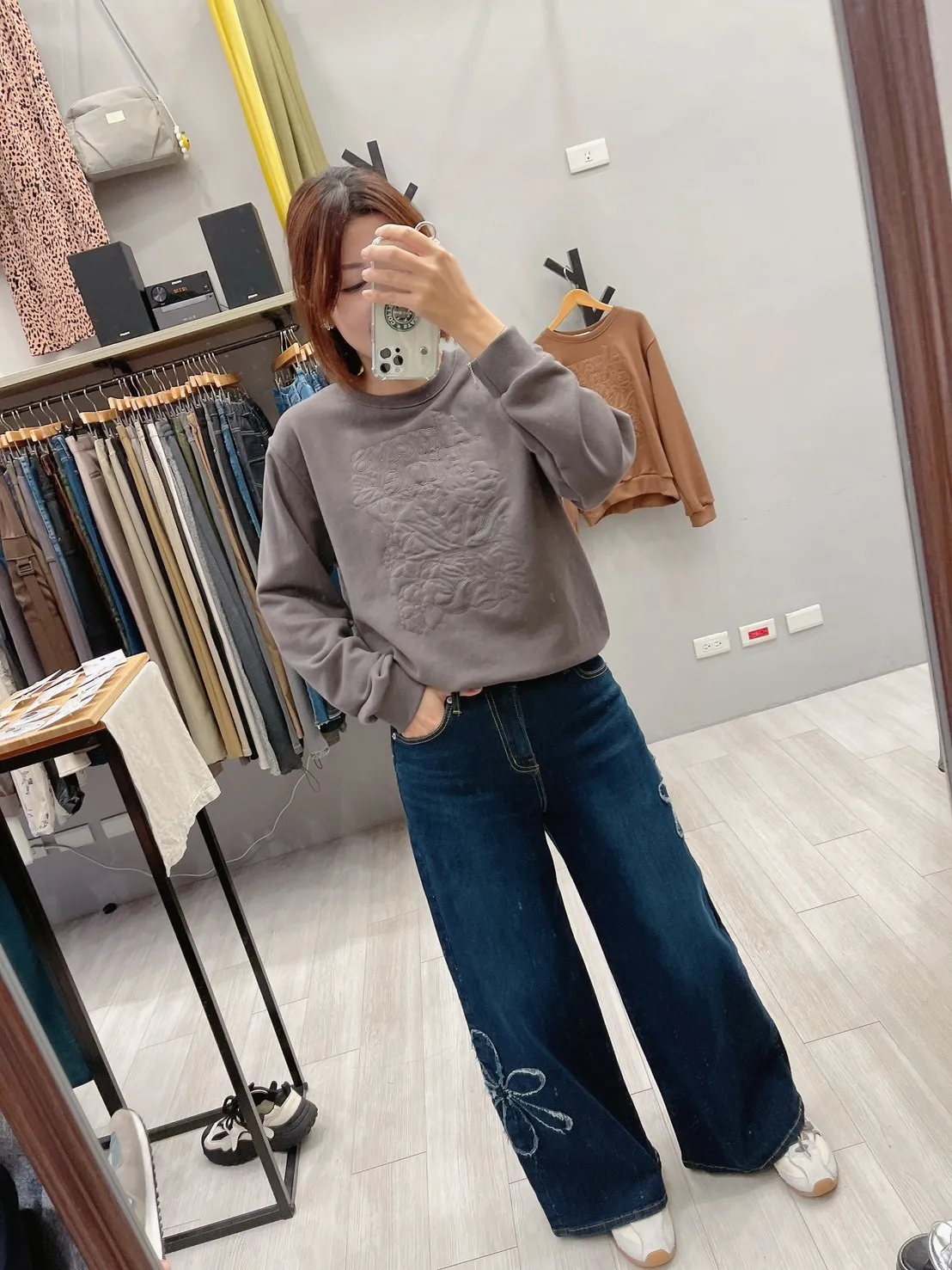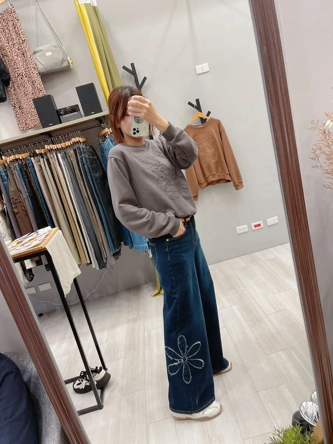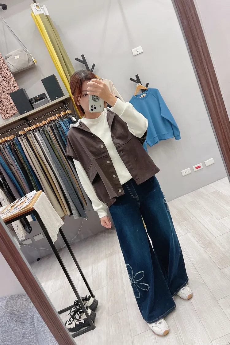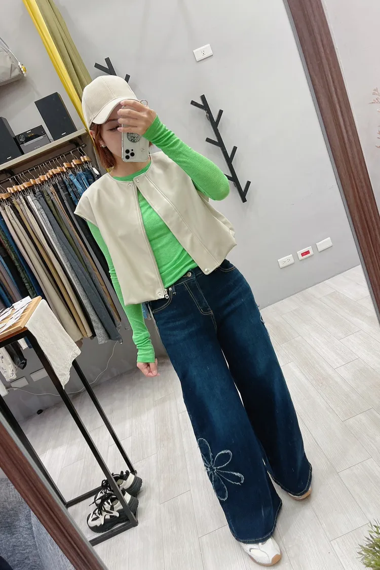 綴大花寬直筒牛仔褲