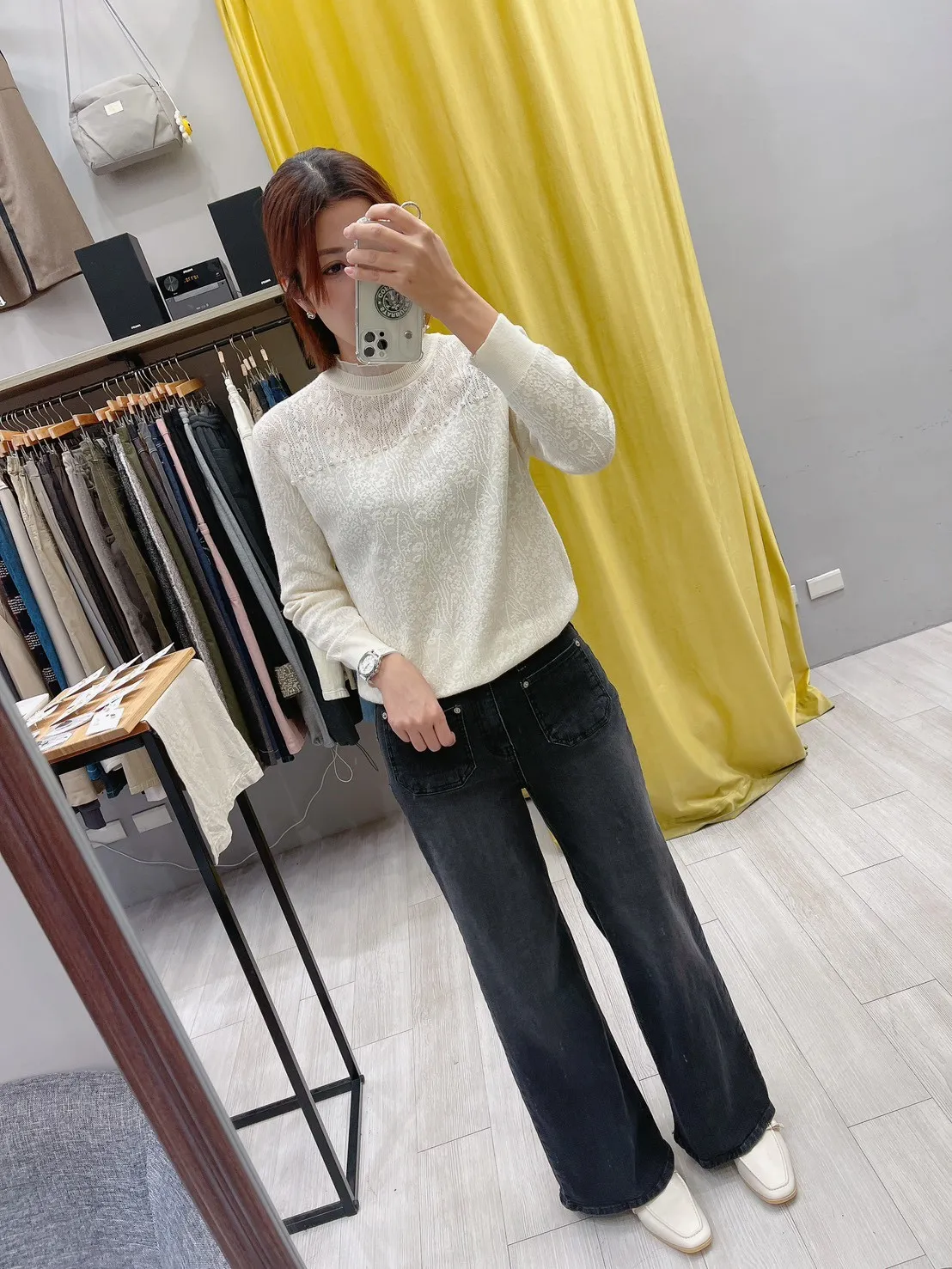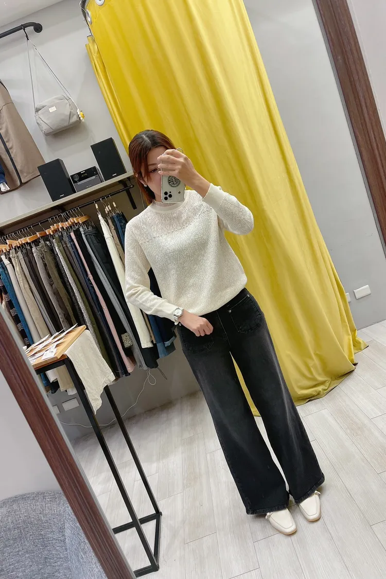綴大花寬直筒牛仔褲