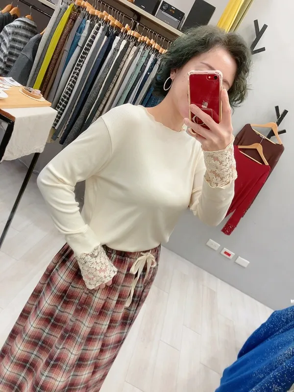 木耳邊袖口刺繡小花螺紋打底衣