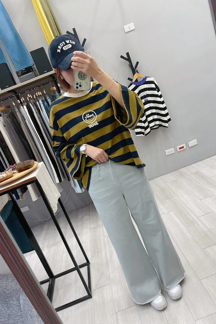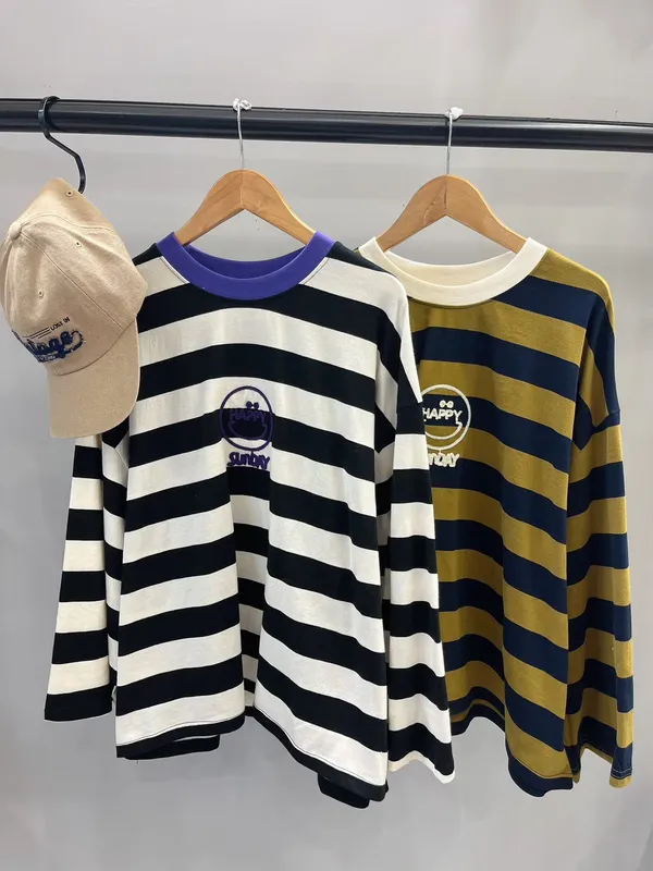 HAPPY笑臉雙色寬橫條棉T