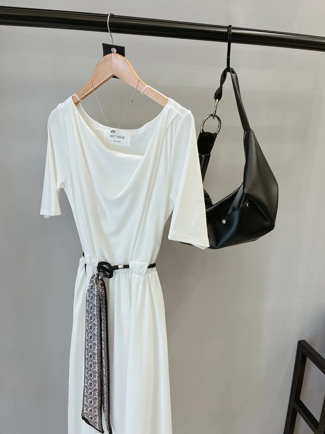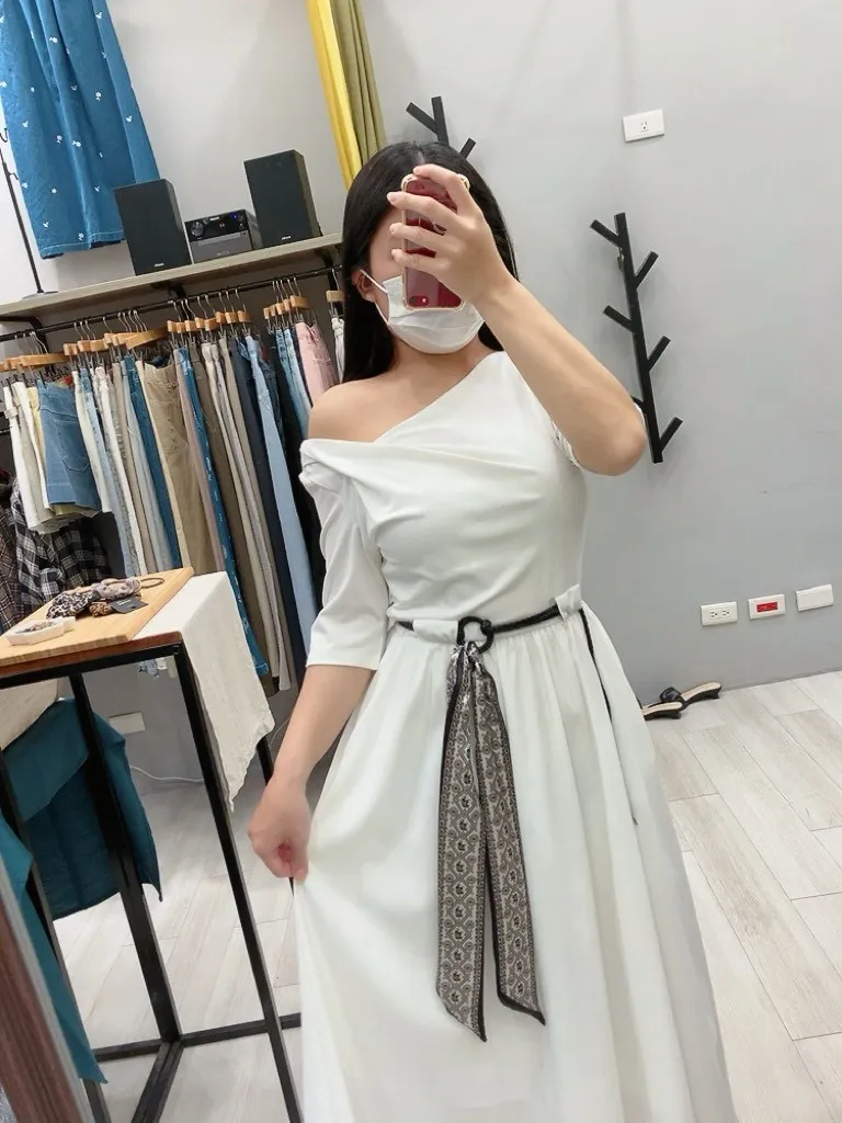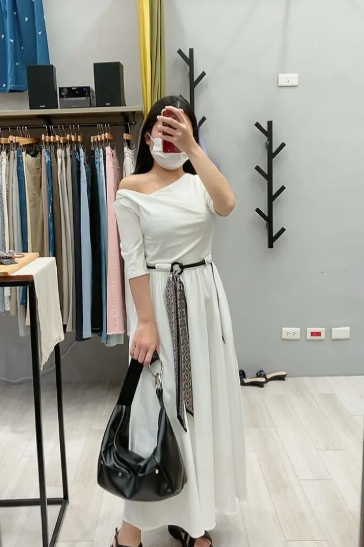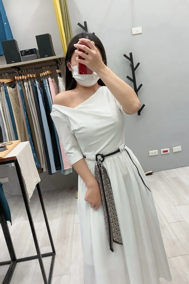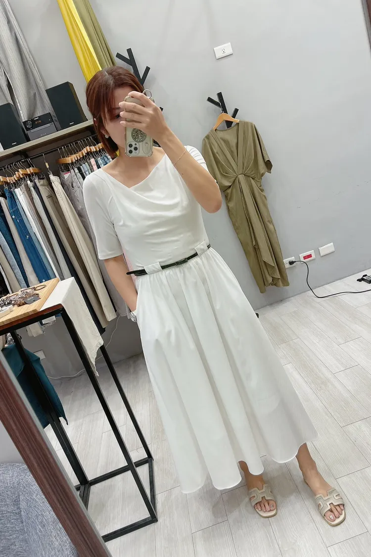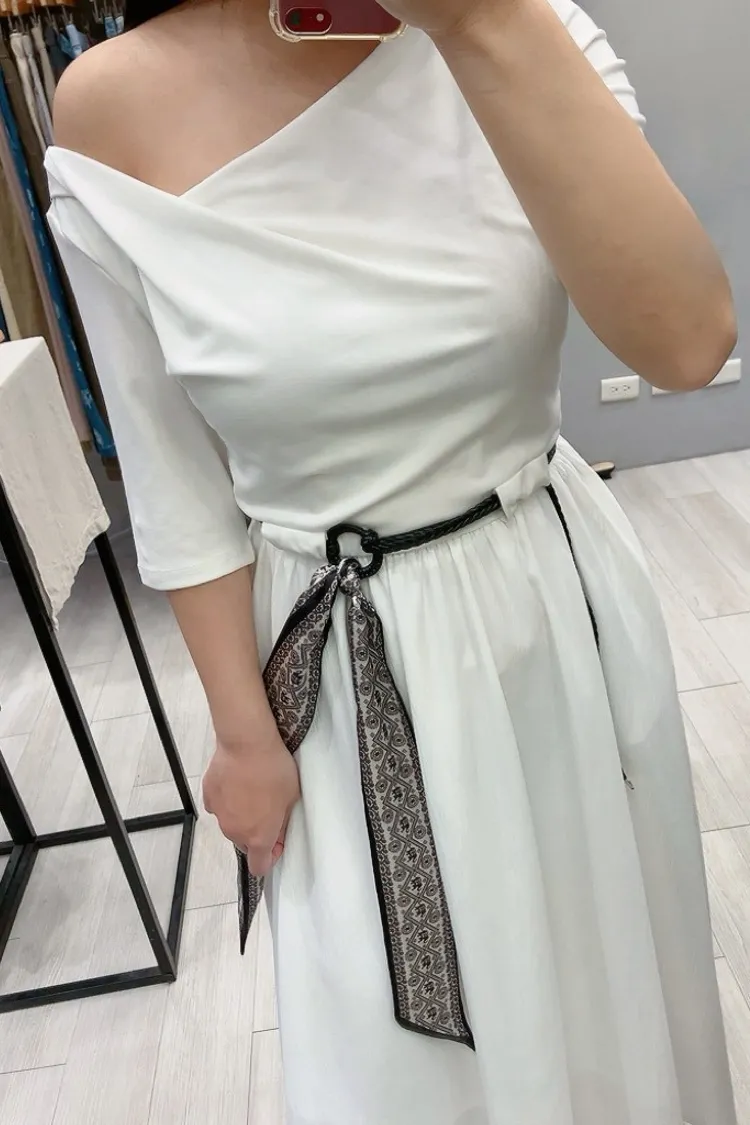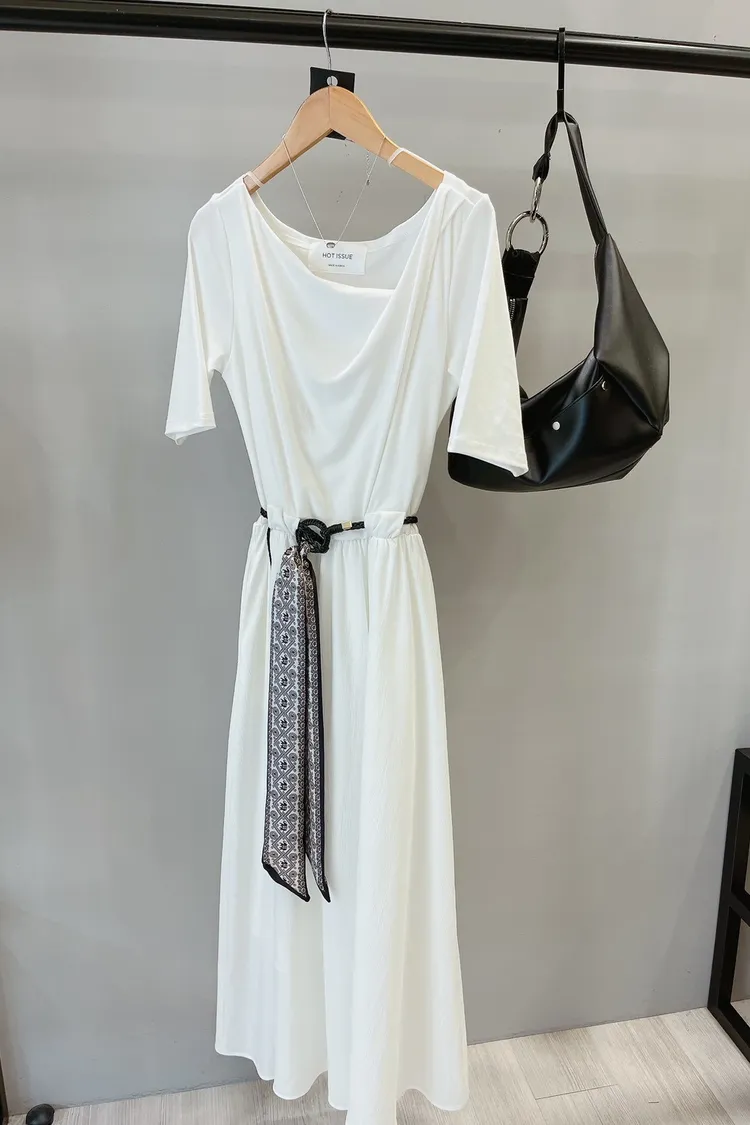 斜羅馬領附緞帶腰帶洋裝