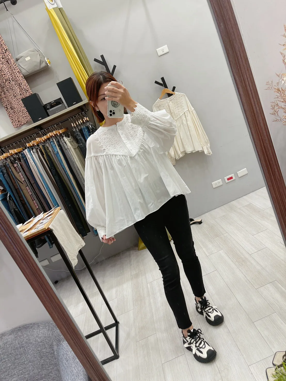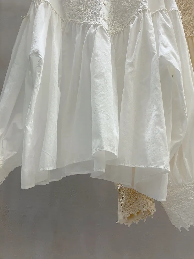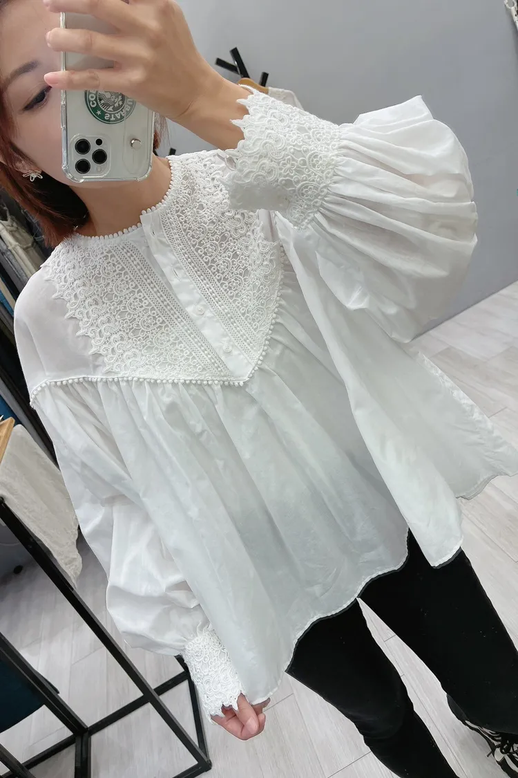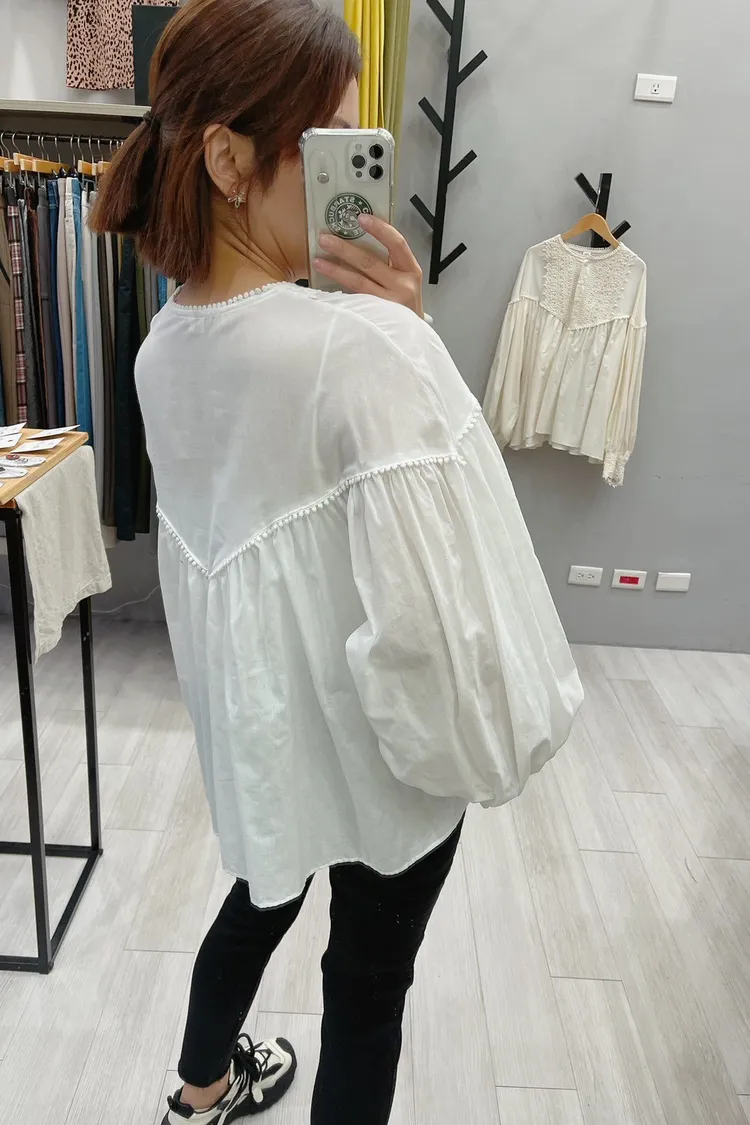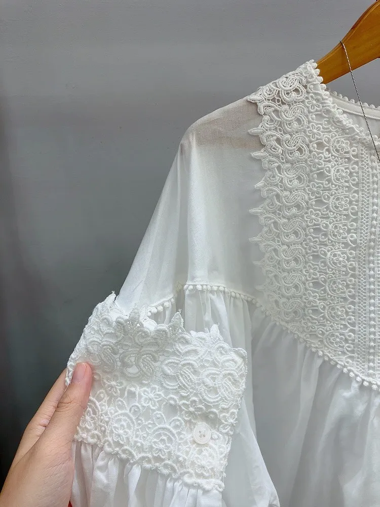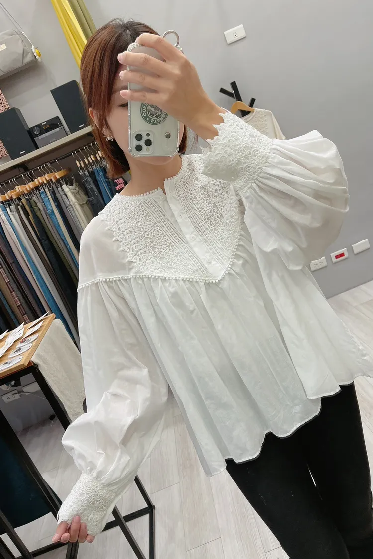 仙氣爆棚! 胸前 V 字精緻蕾絲,燈籠袖口浪漫收褶。