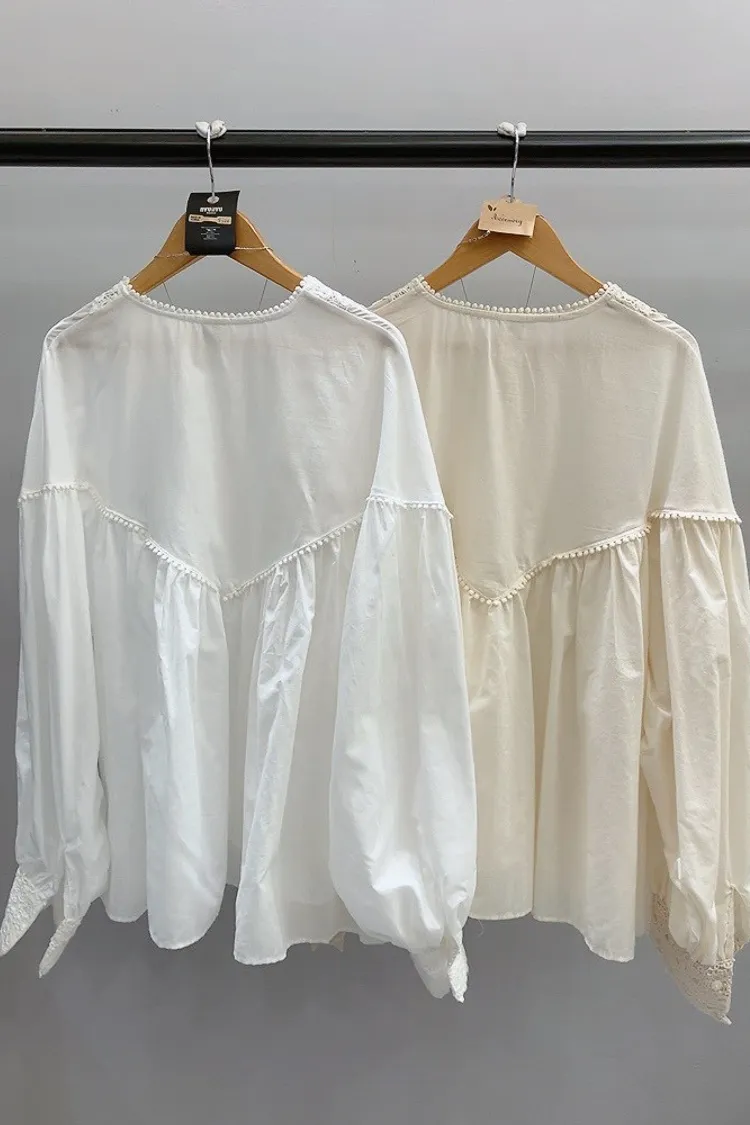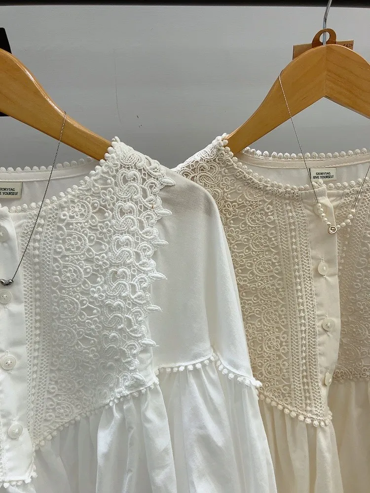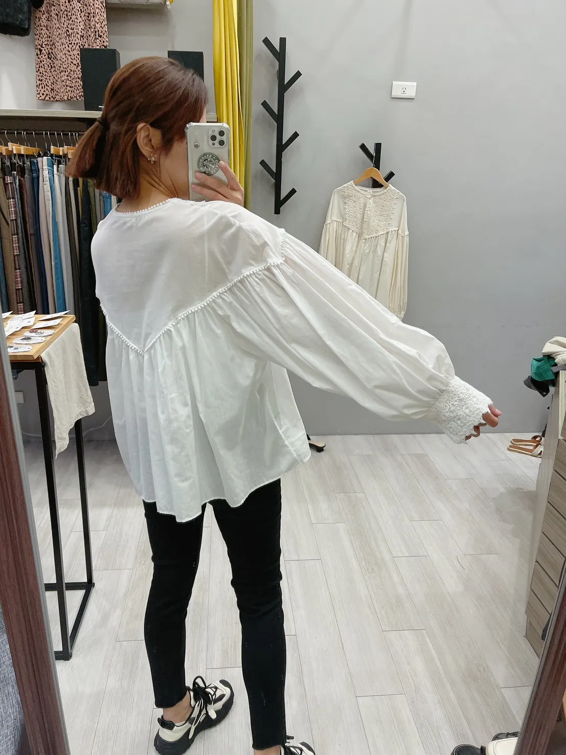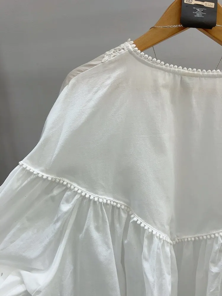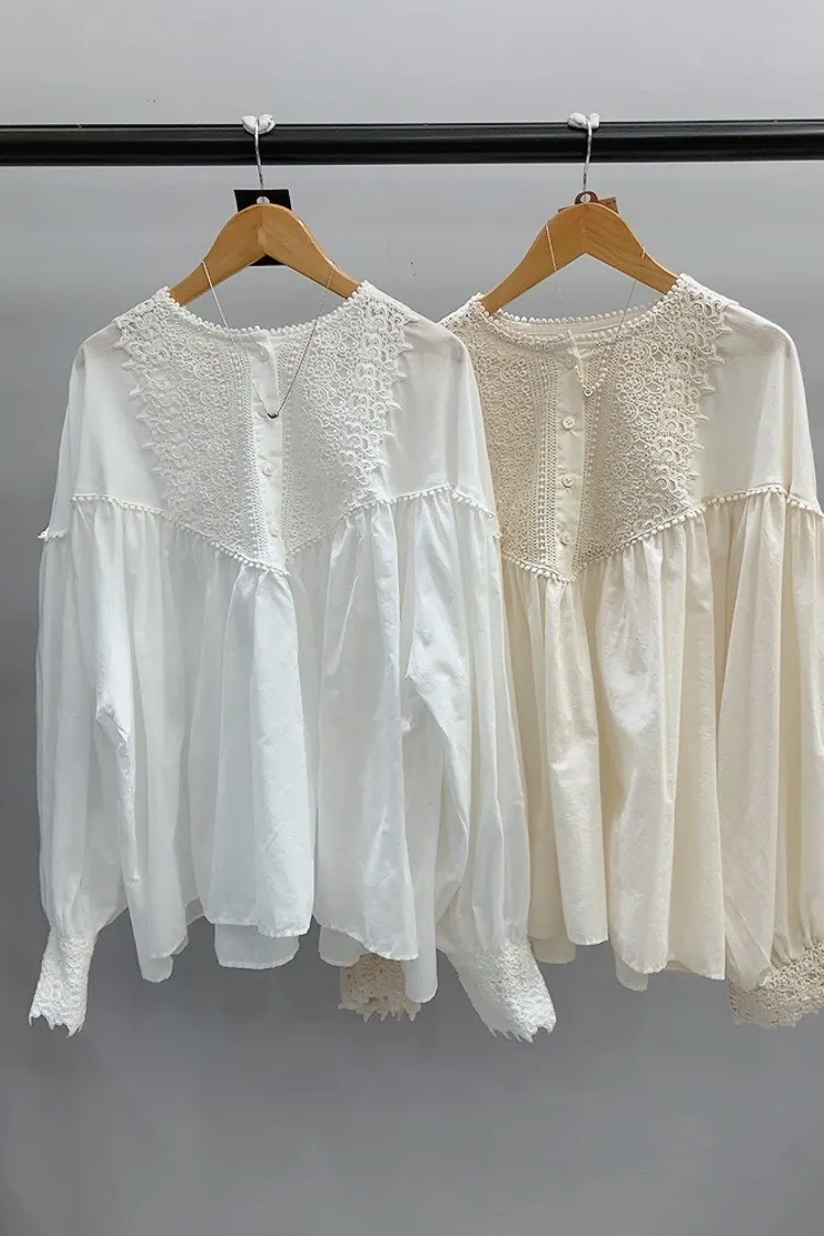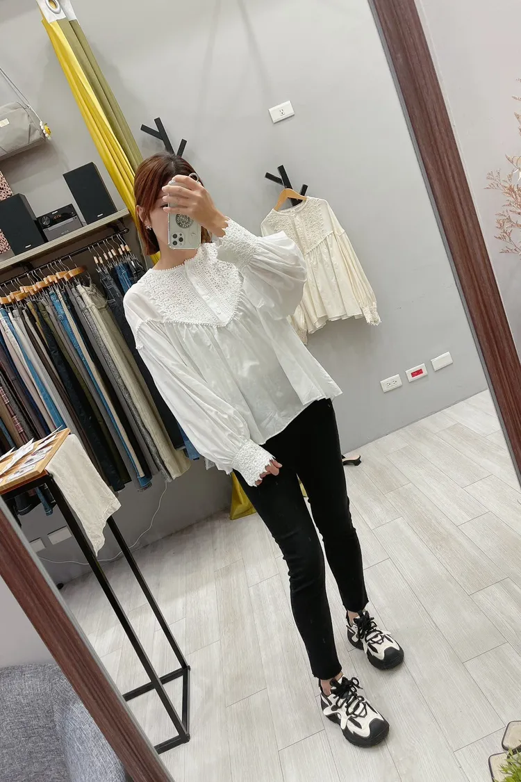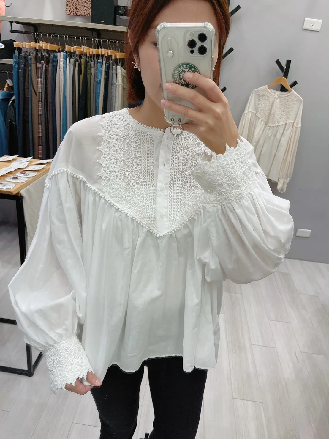 仙氣爆棚! 胸前 V 字精緻蕾絲,燈籠袖口浪漫收褶。