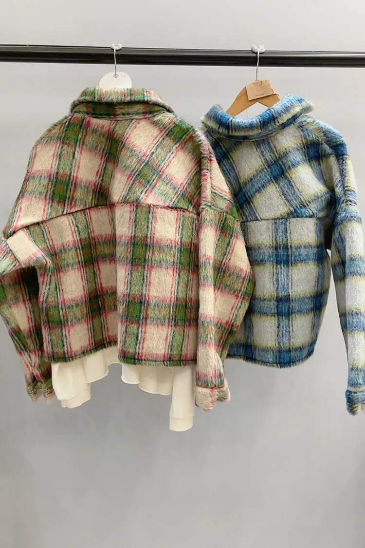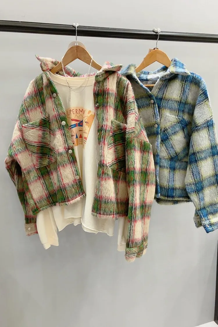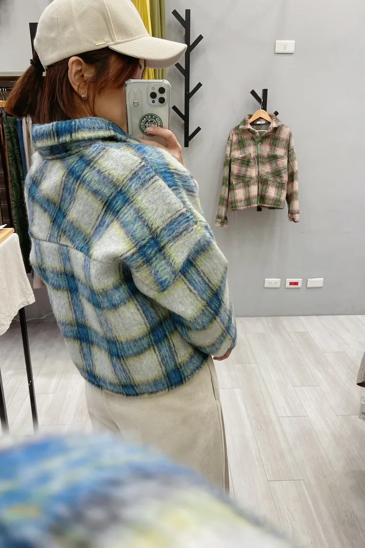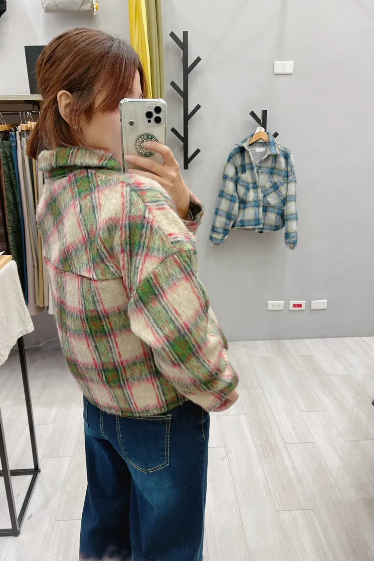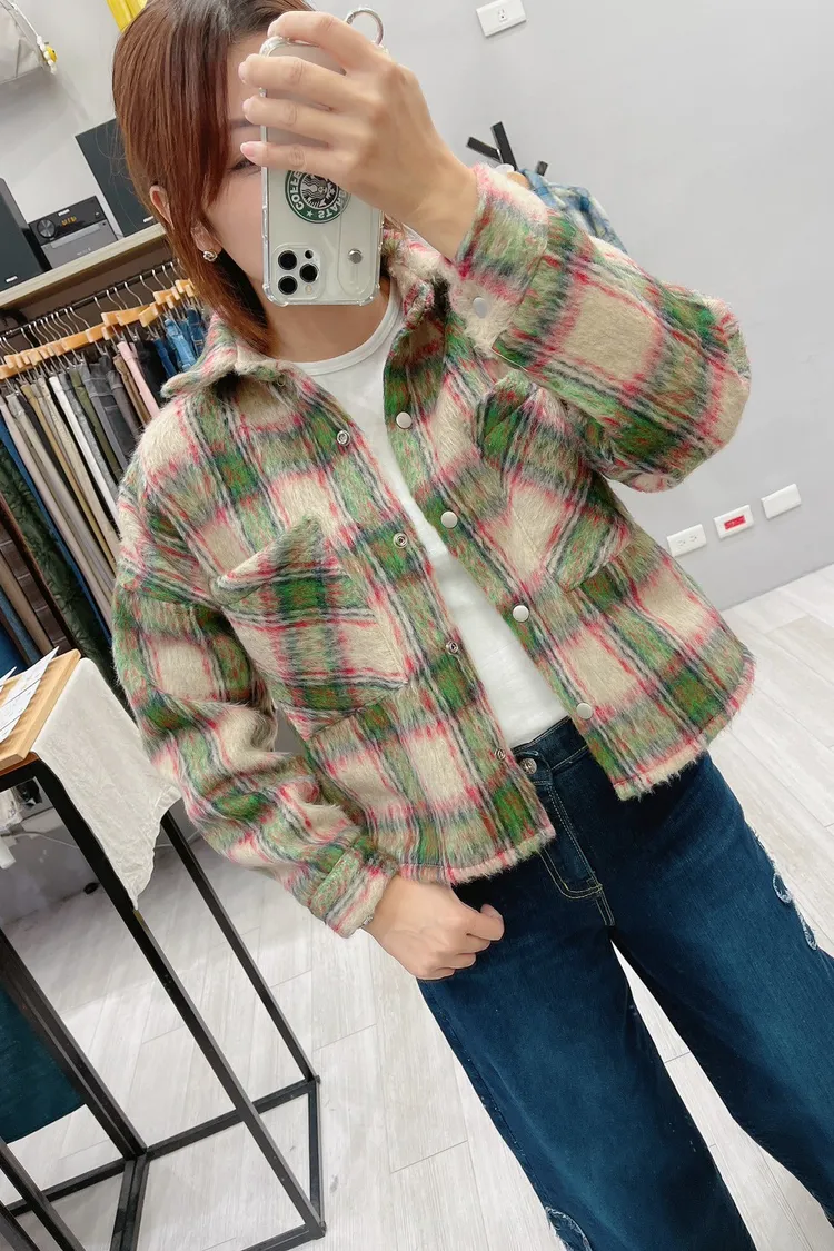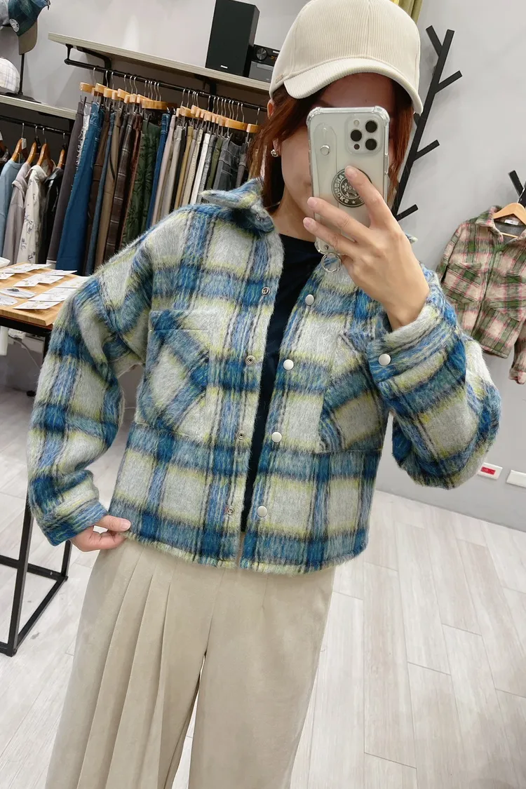 霧銀壓釦毛感格紋雙口袋襯衫外套