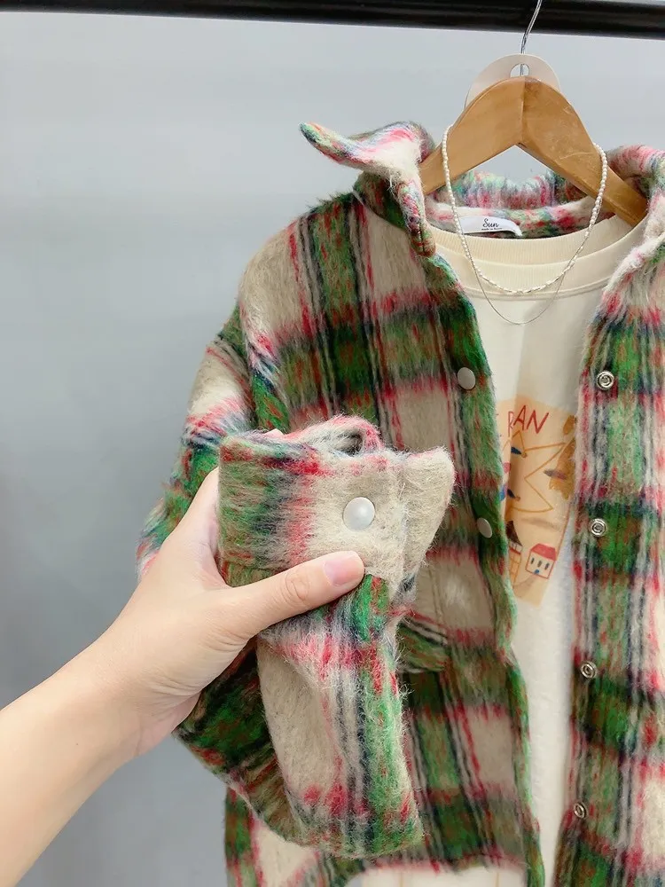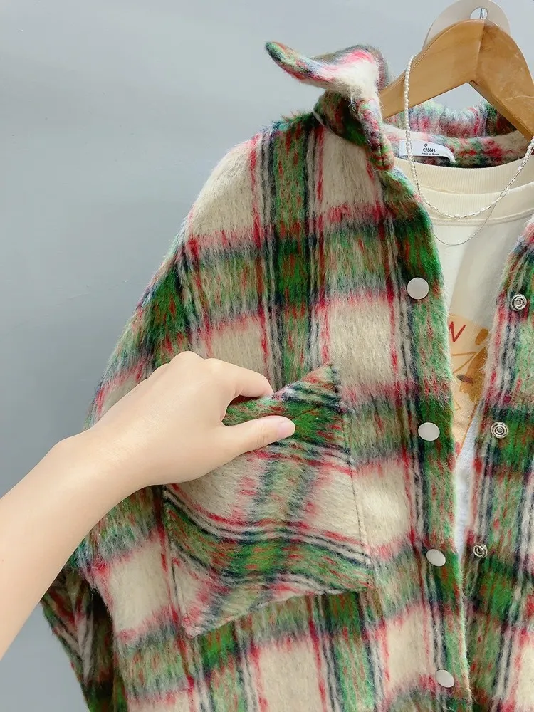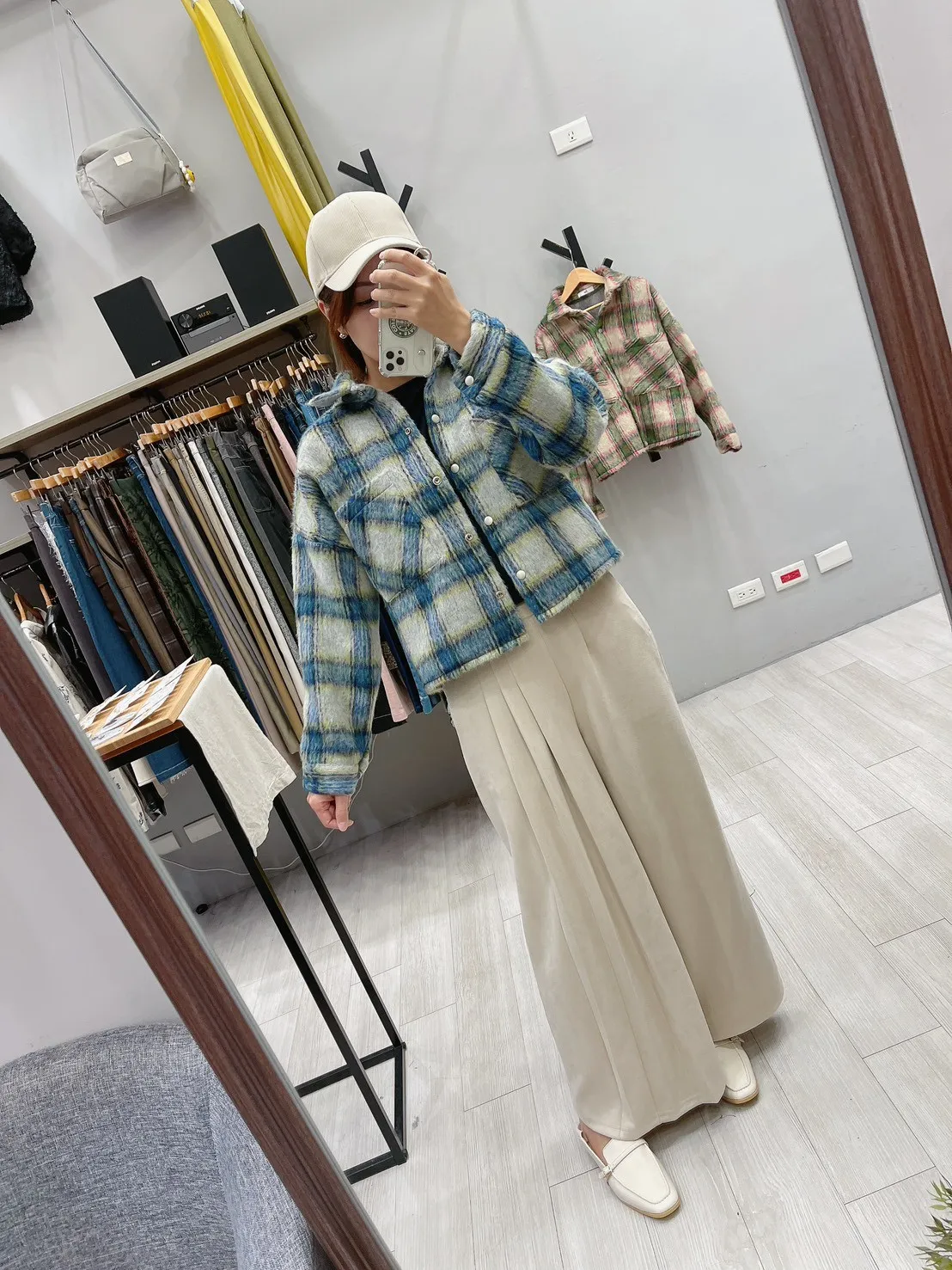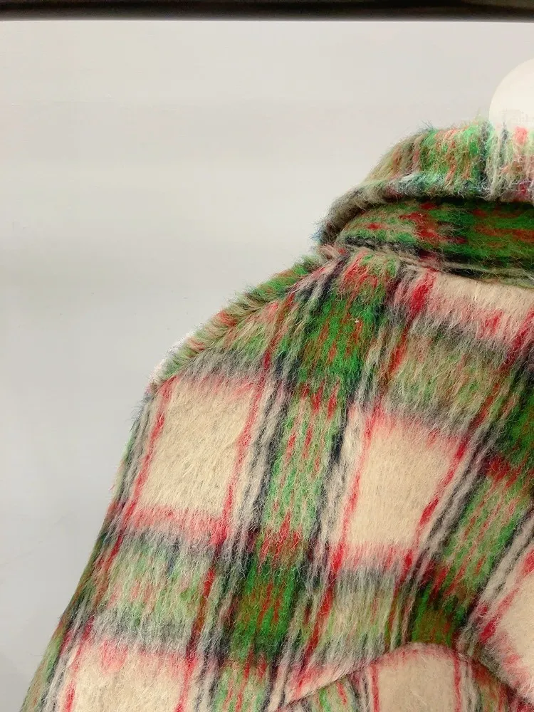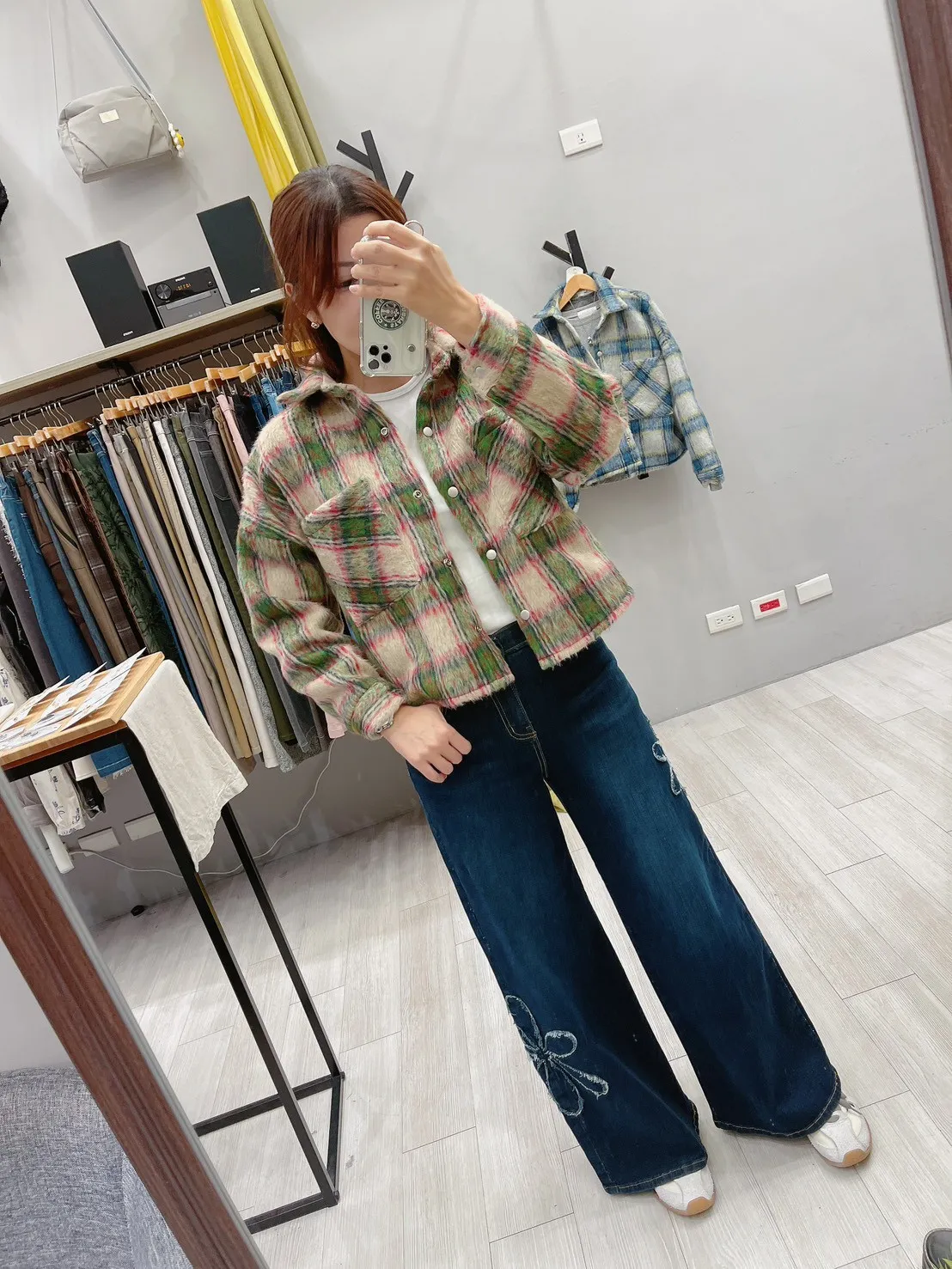 霧銀壓釦毛感格紋雙口袋襯衫外套