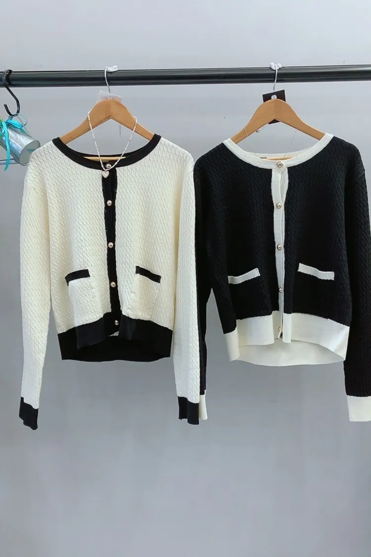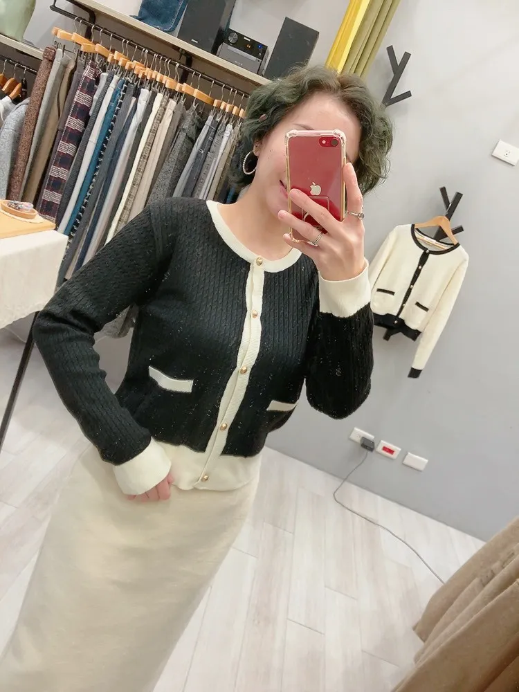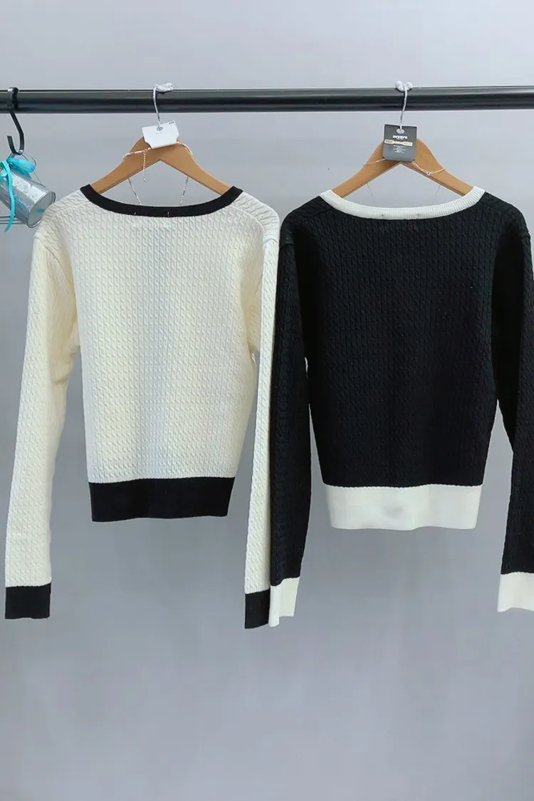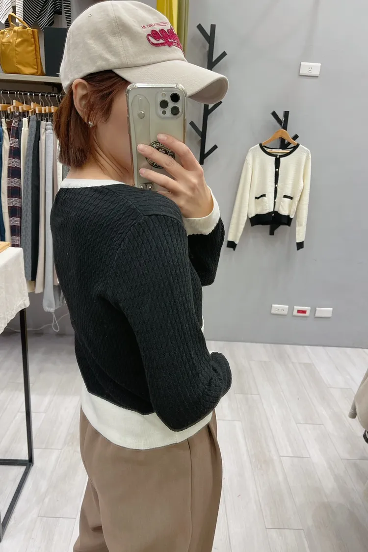 霧金釦對比色麻花針織上衣