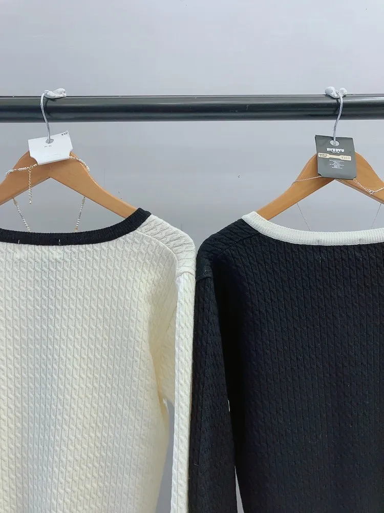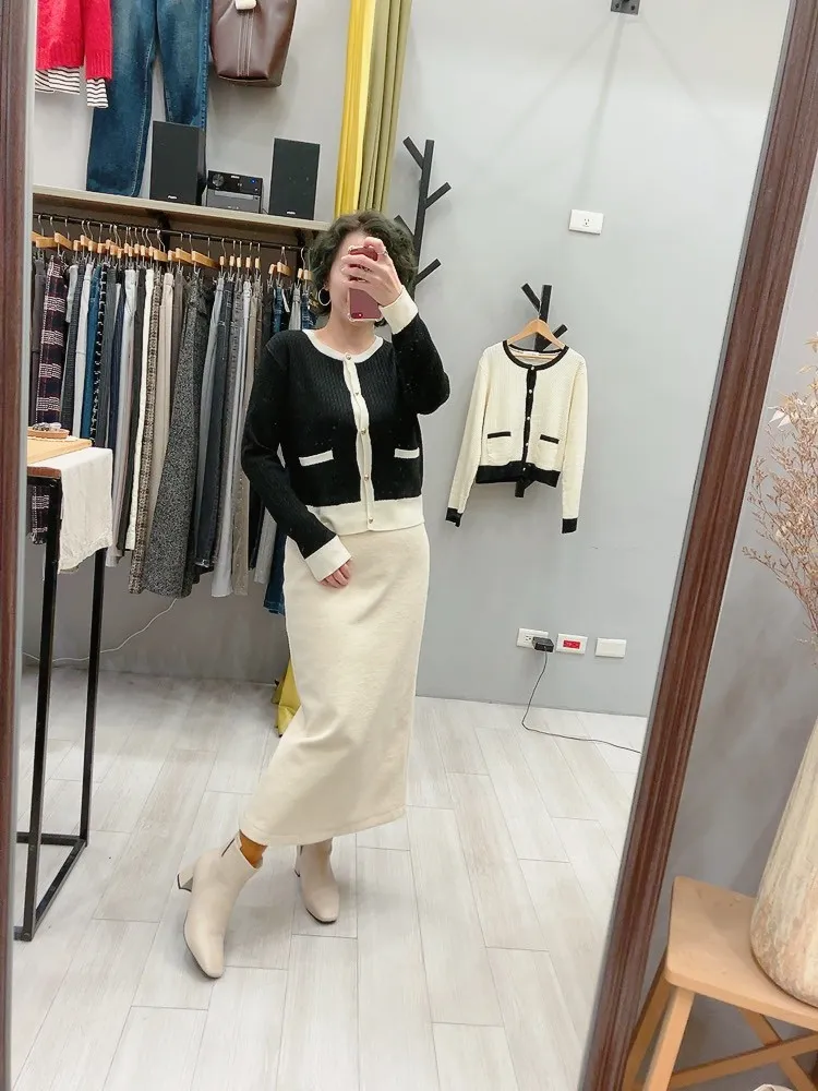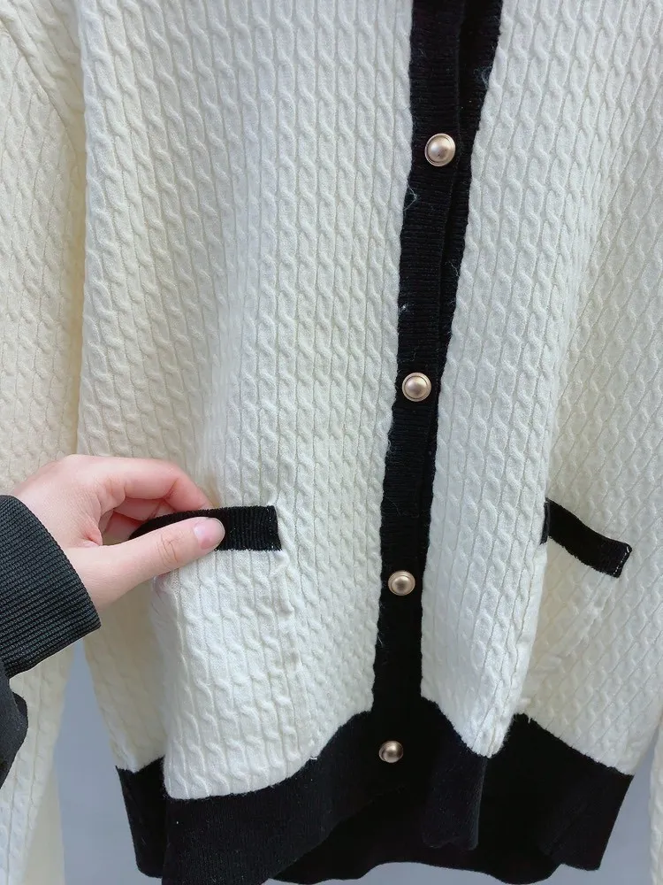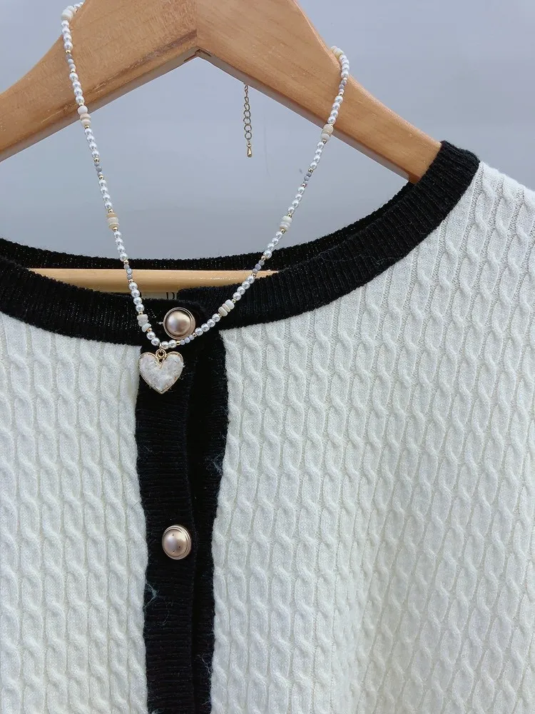 霧金釦對比色麻花針織上衣