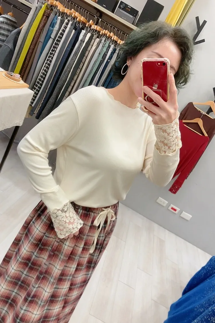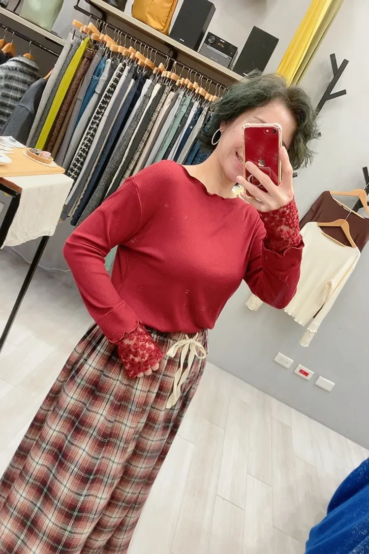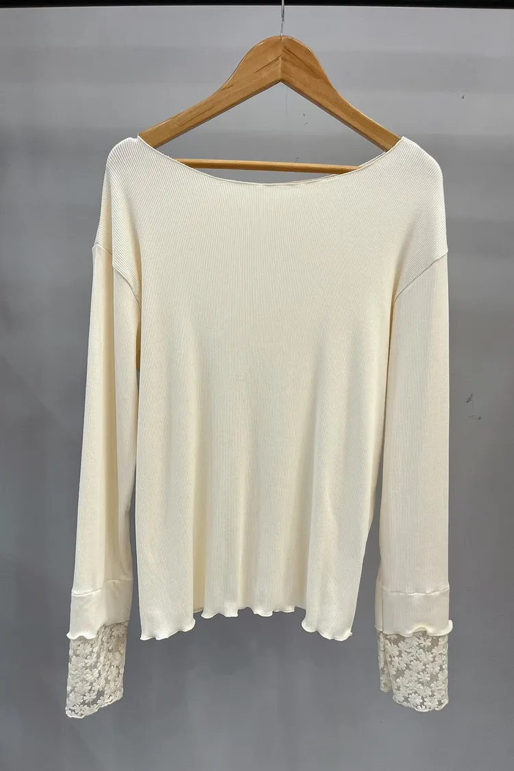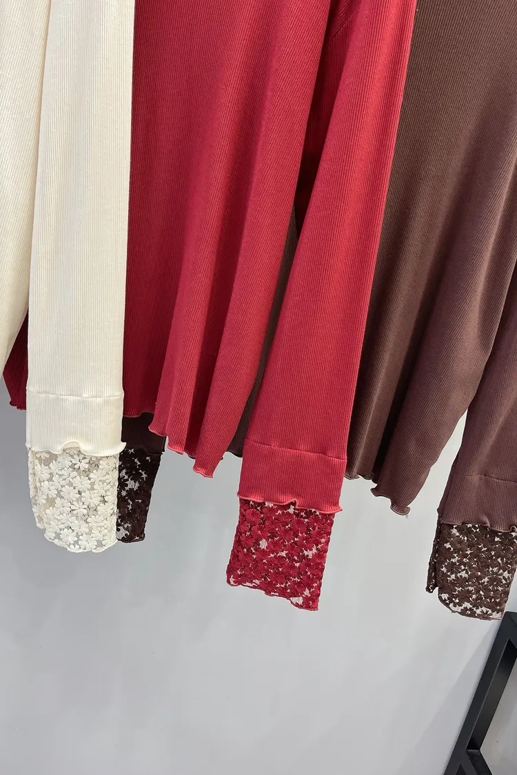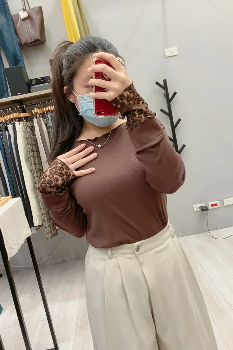 木耳邊袖口刺繡小花螺紋打底衣