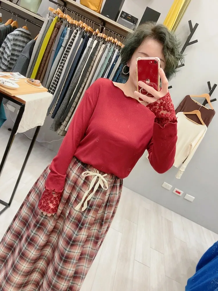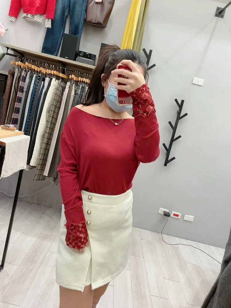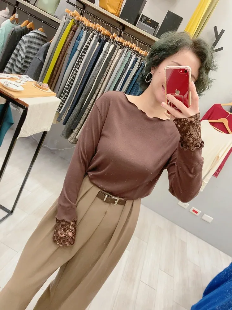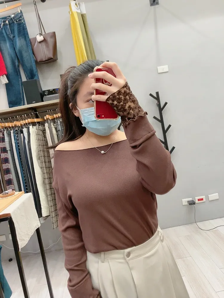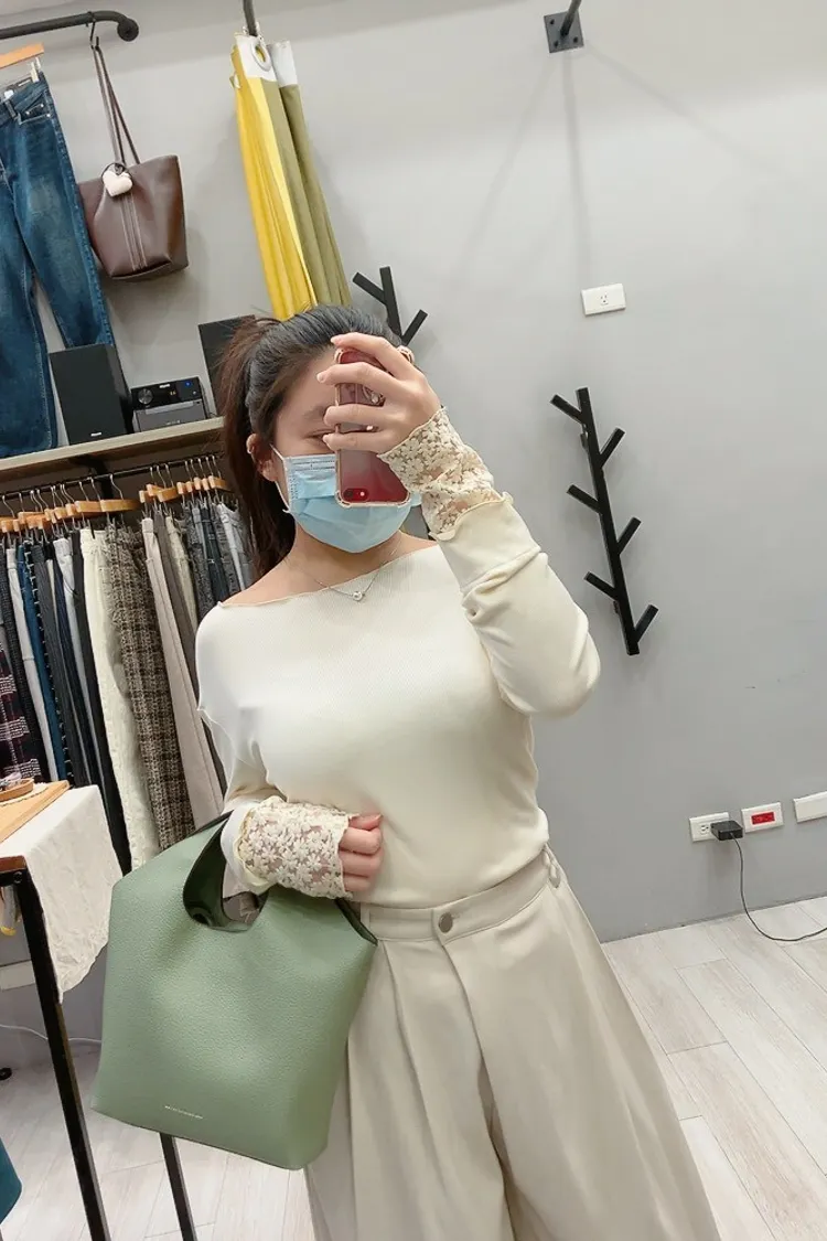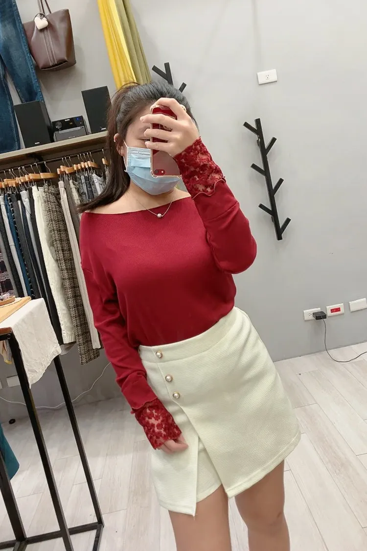木耳邊袖口刺繡小花螺紋打底衣